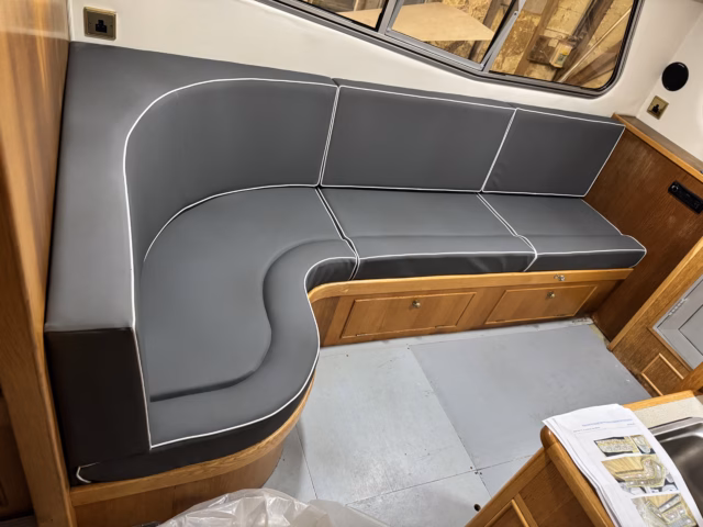 Gone were the faded, worn fabrics. In their place, the new upholstery brought a crisp, clean, and contemporary feel. The chosen colour palette transformed the interior, making the space feel modern and more inviting. The meticulous stitching and expert finish elevated the boat’s overall luxury appeal, perfectly complementing its elegant exterior.